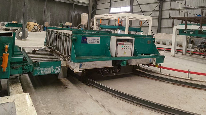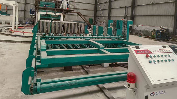 出板系統(tǒng)由出板機與翻板機組成。出板機采用一次拖板設計,配備變頻驅(qū)動裝置,具有拉力大、運行平穩(wěn)、效率高等優(yōu)點。取出的板材可通過液壓系統(tǒng)實現(xiàn)自動合攏。翻板機通過液壓驅(qū)動,將墻板旋轉(zhuǎn)90度,并自動將板材與鋁合金底模分離,隨后再進行第二次90度翻轉(zhuǎn),完成出板全過程。