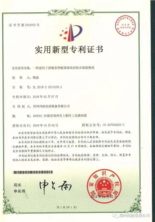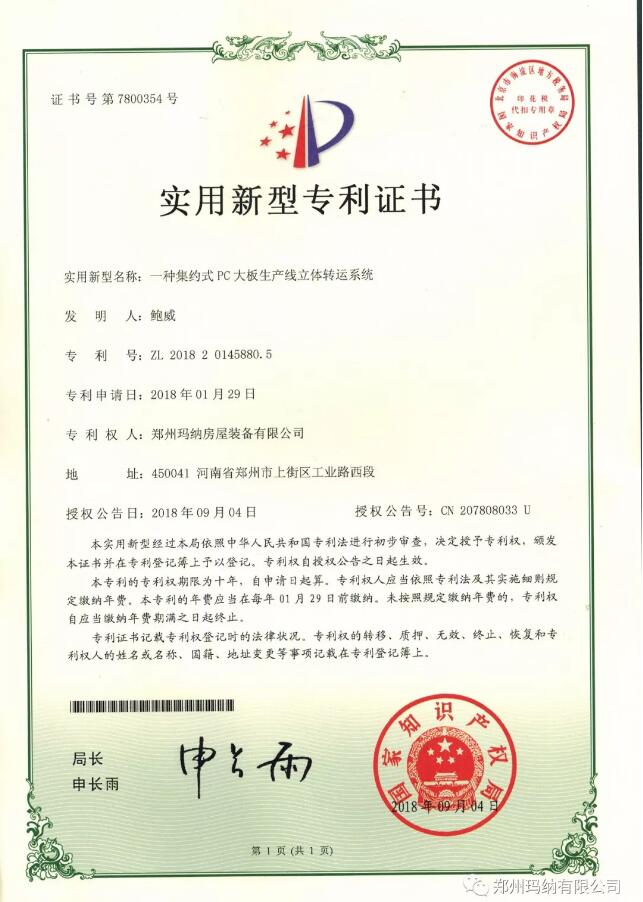 近兩個月,瑪納公司喜獲兩項新型實用證書,分別是“一種集約式PC大板生產(chǎn)線立體轉(zhuǎn)運系統(tǒng)”和“一種適用于拼裝多種幅面墻體的組合墻板模塊”。號分別為:ZL 2018 2 0145880.5和ZL 2018 2 0211236.3。
