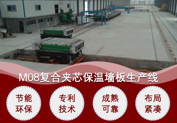 M08復合夾芯保溫墻板生產線是鄭州瑪納創新研發成功的,填補了國內外生產復合夾芯類板材的空白。鄭州瑪納有著30年專注研發、設計、制造墻板裝備的歷史,年年熱銷的墻板裝備生產線成就了眾多投資輕質隔墻板項目的企業及個人,用鄭州瑪納墻板裝備生產的優質板材,建材市場供不應求。