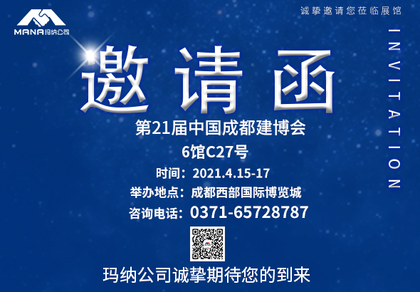瑪納公司受邀參加4月15日-17日在成都西部博覽城的第21屆中國成都建博會,誠摯邀請您蒞臨瑪納公司展位(6館C27號),期待您的到來!