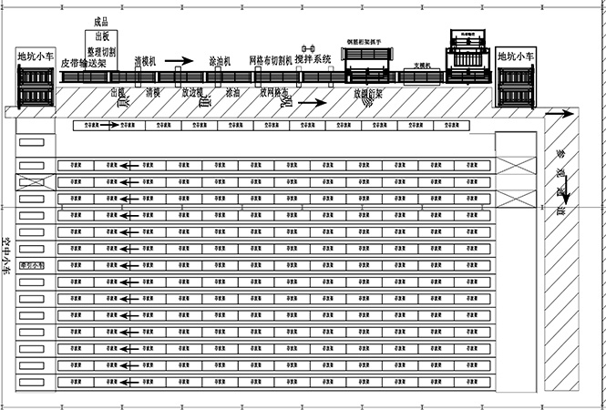 出滾壓機后的托板構(gòu)件,進入鋼筋桁架放置平臺。首先放置、壓合定位桁架,然后平臺震動,以完成桁架底部鋼筋的有效埋入混凝土(此屬疊合樓板),或底部鋼筋下面的聯(lián)接板有效埋入混凝土(此屬永久模板)。之后,將托板構(gòu)件推入養(yǎng)護架。