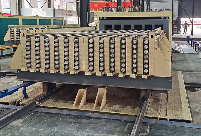 根據(jù)產(chǎn)能要求設(shè)計(jì)石膏墻板循環(huán)生產(chǎn)線,生產(chǎn)長(zhǎng)度3000mm×寬度600mm×厚度100mm和長(zhǎng)度3000mm×寬度600mm×厚度200m兩種規(guī)格產(chǎn)品,既滿足單獨(dú)生產(chǎn),同時(shí)可混線生產(chǎn),模車(chē)計(jì)劃100mm配置4套(12塊/模),200mm模車(chē)配置4套(6塊/模)。