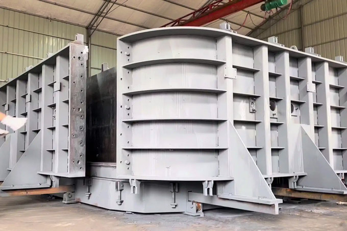 在矩形隧道管節(jié)生產(chǎn)時,通常是先將矩形管節(jié)模板拆分開,然后將捆扎好的鋼筋結(jié)構(gòu)放在兩豎直固定的固定板之間,再將兩拆分后的側(cè)固定板與兩豎直固定板合攏,并向合攏后的管節(jié)模板中澆筑混凝土,待混凝土凝固后將管節(jié)模板拆分,將凝固后的隧道管節(jié)從模板中吊出,從而完成矩形隧道管節(jié)的生產(chǎn)。