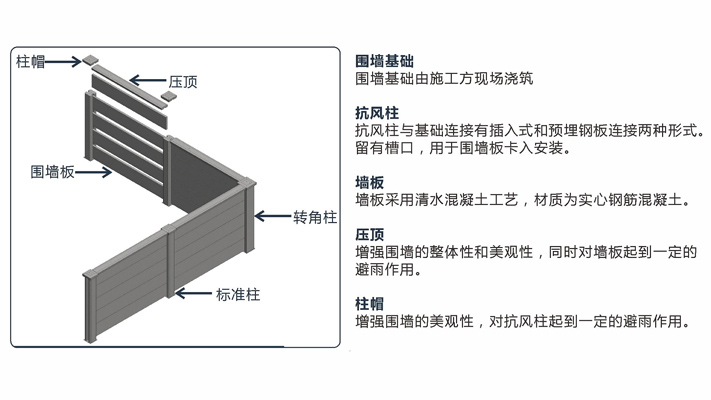 預(yù)制鋼筋混凝土圍墻是一種以墻體、墻壓頂、抗風(fēng)柱、柱壓頂、鐵藝五種部件組成的新型裝配式圍墻。