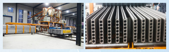 4)上面成型及出板系統:完成澆注成組立模后,由上面成型機成型上平面,等養護完成后,開模,再由出板機把成型板推出,以供打包。