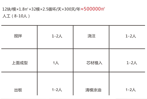 1. 成型機一般做得較大,一次成型12或更多塊墻板,設備笨重,不能移動;成型操作(開模、清潔模具、合模、插入面板、灌注輕質混凝土、壓平等)需要在原地分批完成,工效較低。