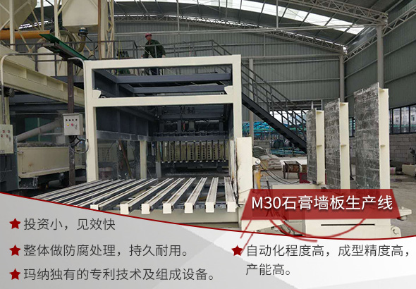 ①M30石膏墻板生產線是鄭州瑪納引進國外先進的石膏墻板生產工藝,經過技術創新,研發成功的新型石膏隔墻板生產裝備。生產的石膏隔墻板優質整平,不吸潮,不龜裂,不變形,各項性能指標順利通過技術驗證,符合現行標準且優于現行標準。